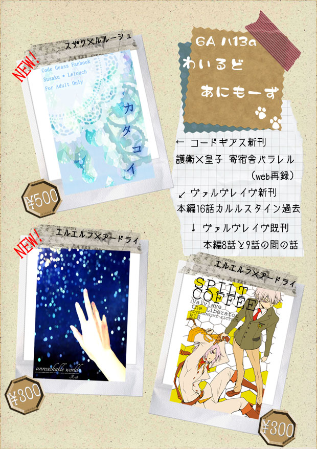 ギアスの新刊が少しだけ心もとない部数だった気がするので、二月のスザルルオンリーにも参加しますので、その分の取り置き承ります。